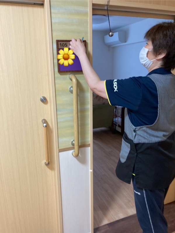 避難が完了していることを確認し、居室ドアに目印の紙を貼っていきます。