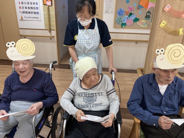 雨音を聞きながら楽しく過ごせる歌をみなさんで唄いました。カエルの歌の輪唱♪チョキとグーで、カタツムリを作りながら、でんでんむしむしカタツムリの歌♪