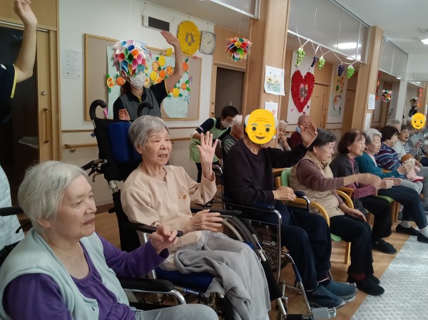 職員の「秋と言えば!」の声掛けに、食欲、スポーツ、秋刀魚、紅葉、焼き芋、柿等利用者様から沢山の言葉が次々とあがりました♪まずは紅葉にちなんだ体操からスタートです\(^o^)/