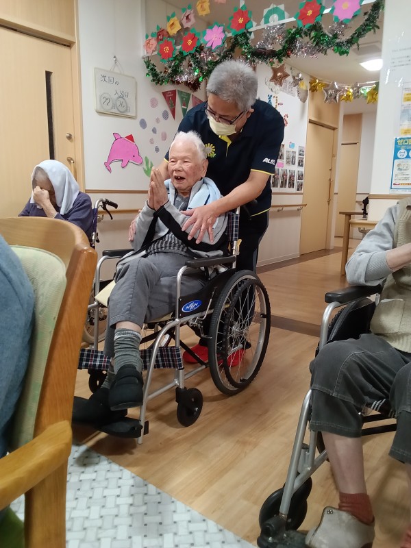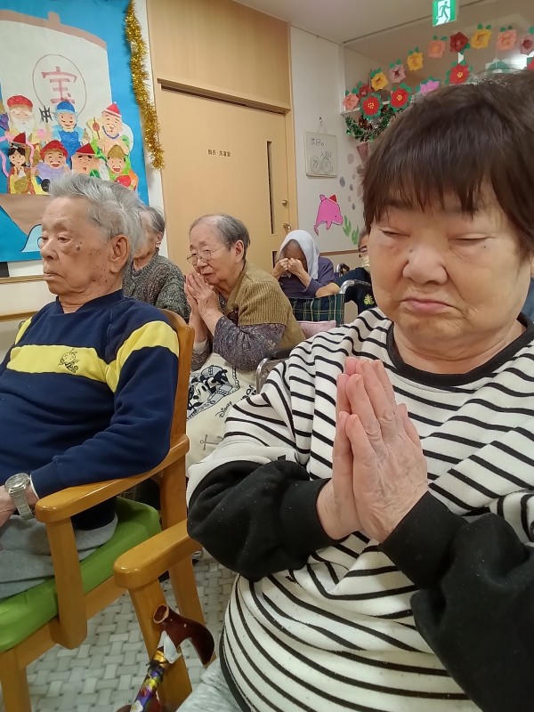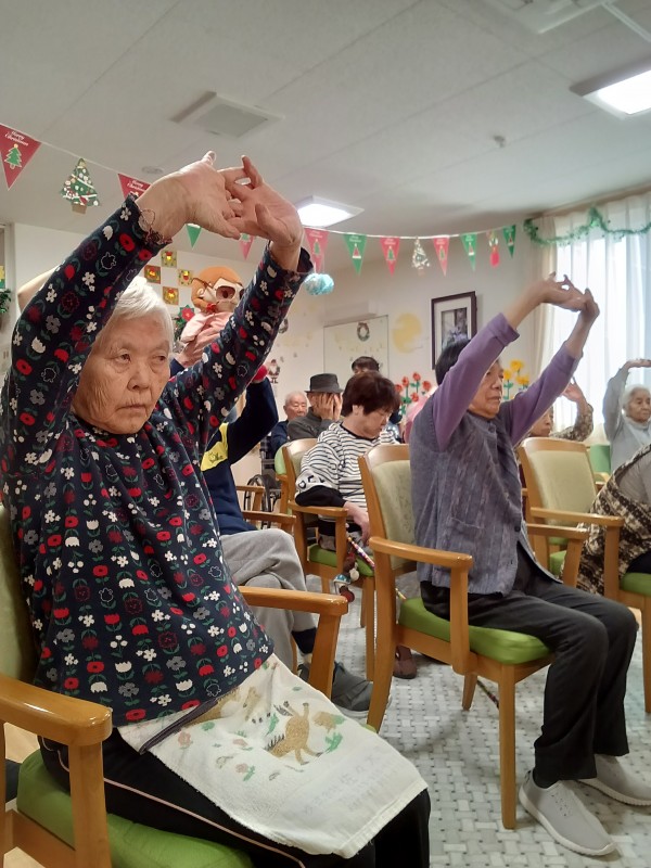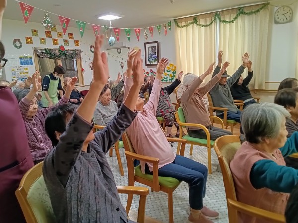 サンタクロースに扮した先生の動きに合わせて頑張ります!