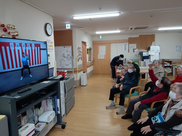 画面の向こうのインストラクターに合わせて、みんなで体を動かしました。