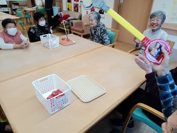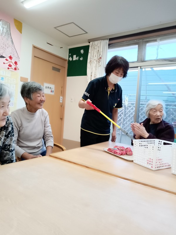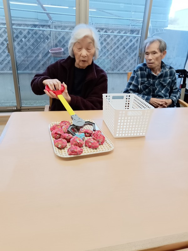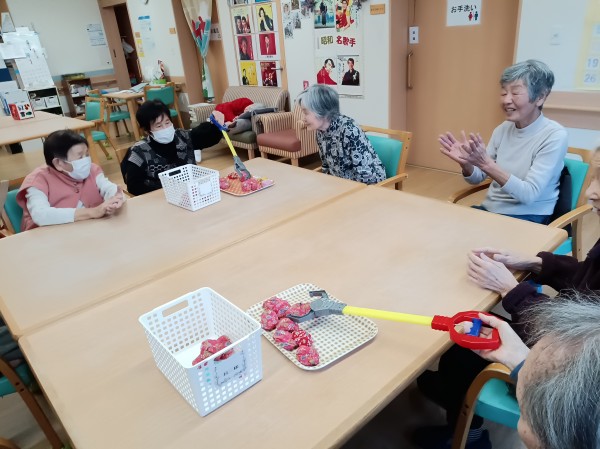 今日は30センチのトングを使ってお手玉を掴むレクリエーションを行いました!