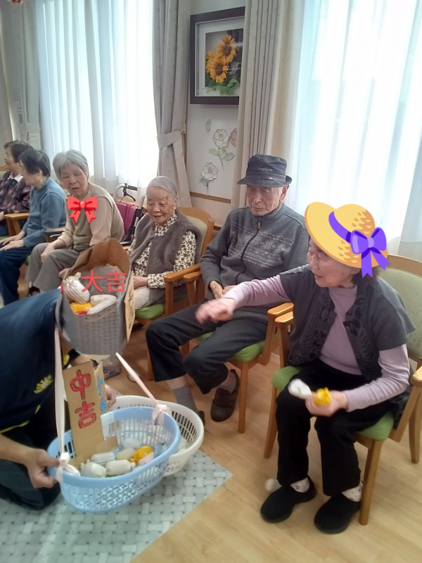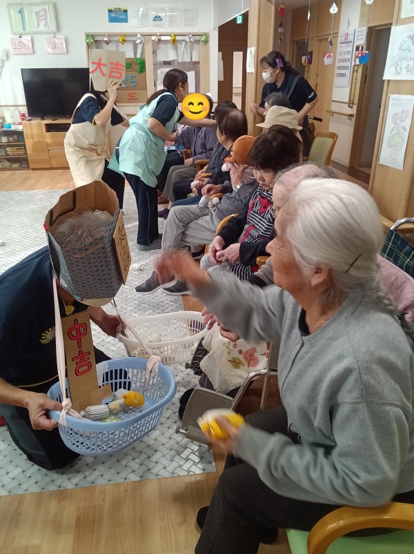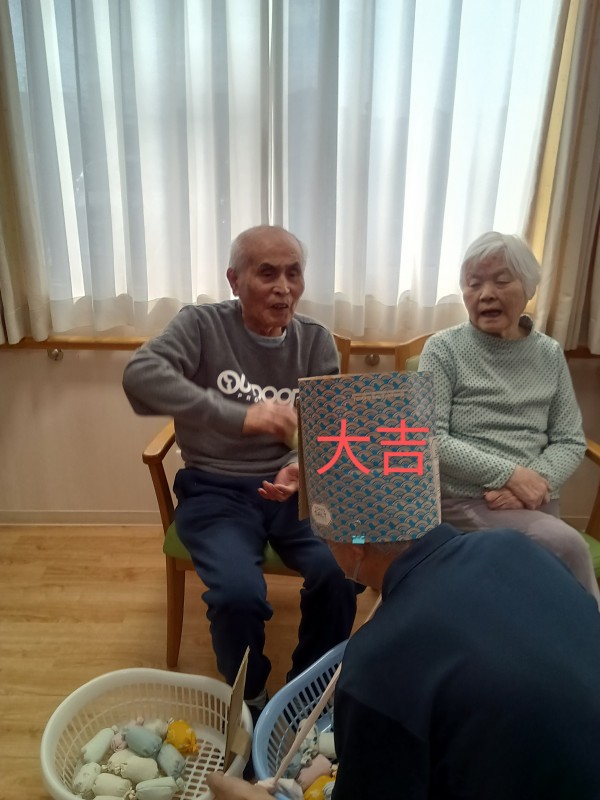 ①おみくじ玉入れ…職員が大吉の帽子をかぶり、中吉、小吉のカゴを持ってご利用者様にお手玉を投げ入れて頂くゲームです♪皆さん狙いを定めて頑張ります(^O^)/