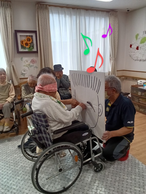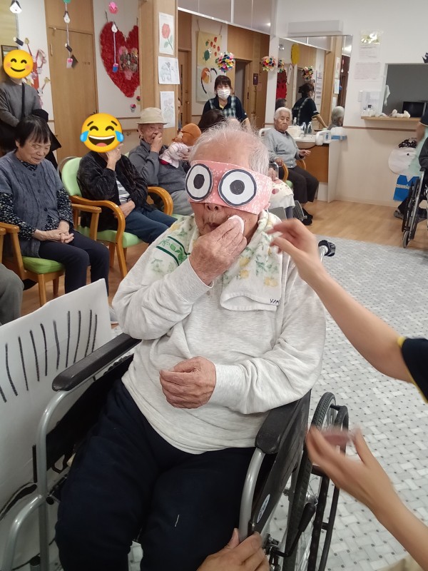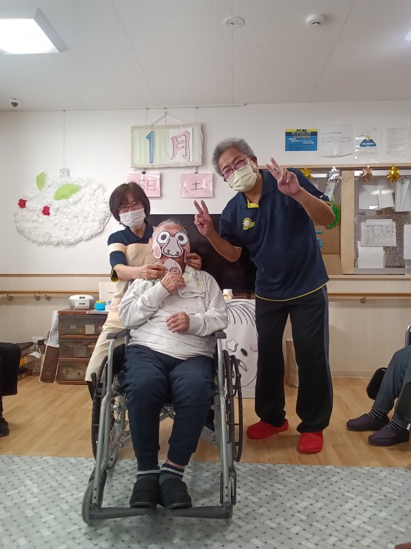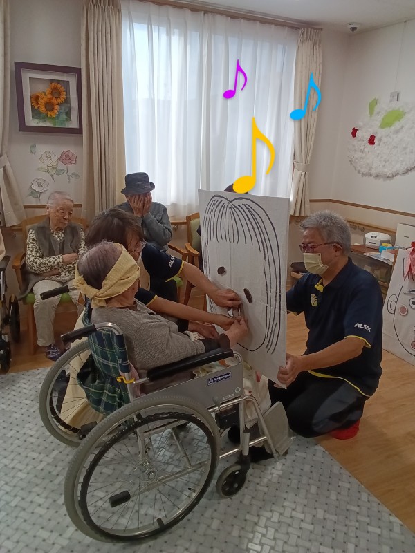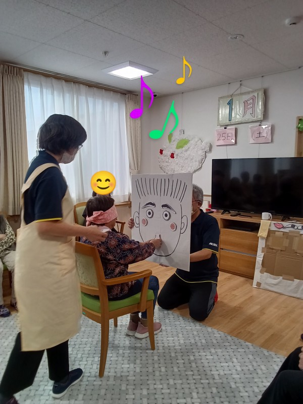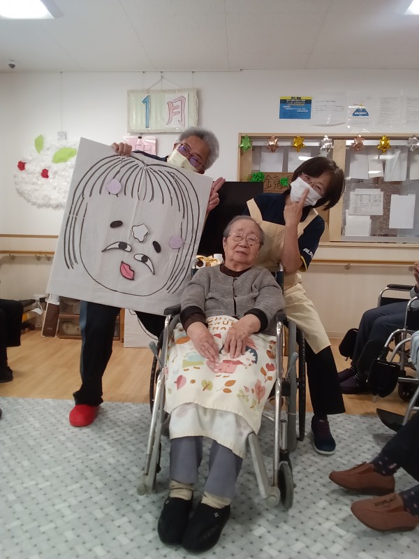 わ〜!大きい!!各ユニットのご利用者様代表3名様が大きな福笑いに挑戦です♪なかなか個性豊かな仕上がりにご利用者様も職員も大笑いでした(≧∇≦)/