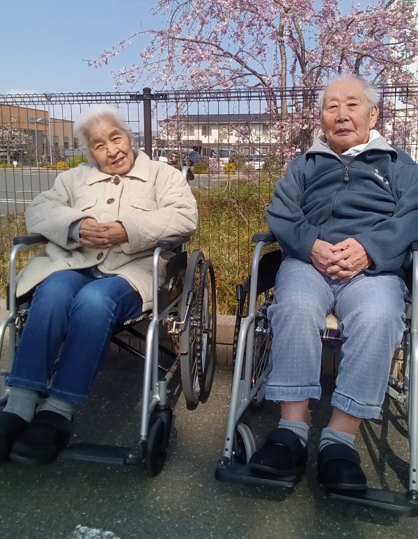散歩の途中でチューリップと枝垂れ桜を見つけました♡ポカポカの陽気で「今日も気持ちが良いね〜」と、話されるご利用者様(^o^)