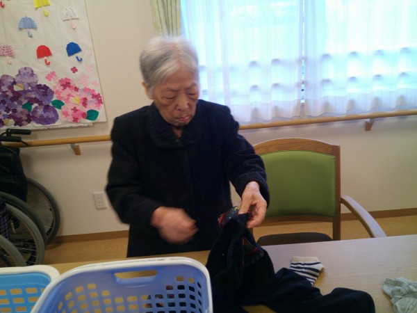 1階入居者様方に洗濯物たたみのお手伝いを協力してもらいました