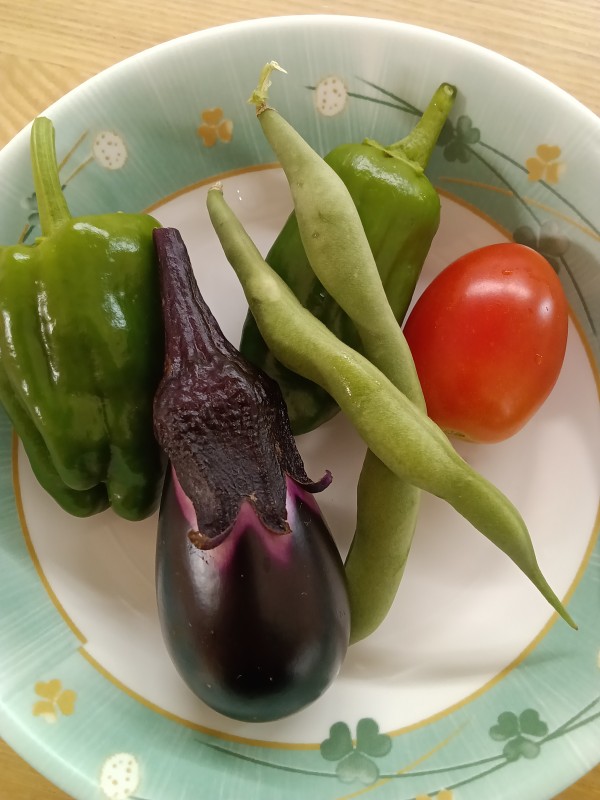 ホームの畑で野菜が少しずつ収穫されている今日この頃、今回はピーマン、インゲン、ミニトマト、ナスです♪どれもツヤツヤで美味しそう(๑´ڡ`๑)