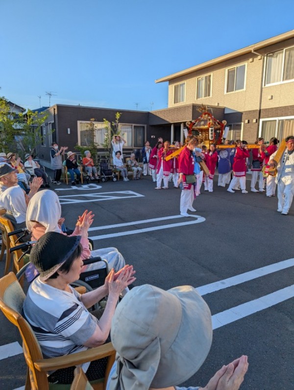 八坂祭りでは悪疫退散、五穀豊穣を願ってお神輿を上空へ投げ上げる「暴れ神輿」が有名です!昨年に続き、地域の皆様のご厚意でホームの駐車場で暴れ神輿を見ることが出来ました!