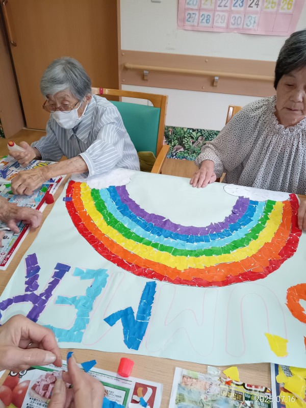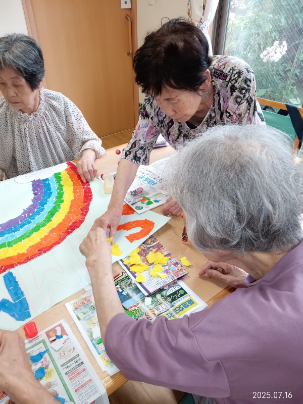 皆で折り紙をちぎって虹の貼り絵を作りました。