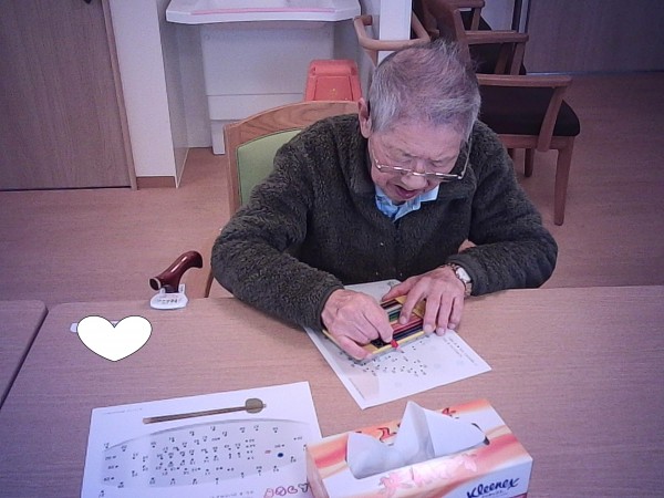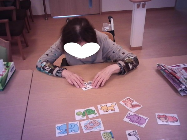 日中のレクリエーション活動で絵合わせゲームと番号探しの脳トレを行いました(*^^)v