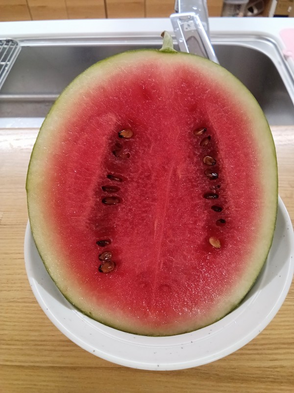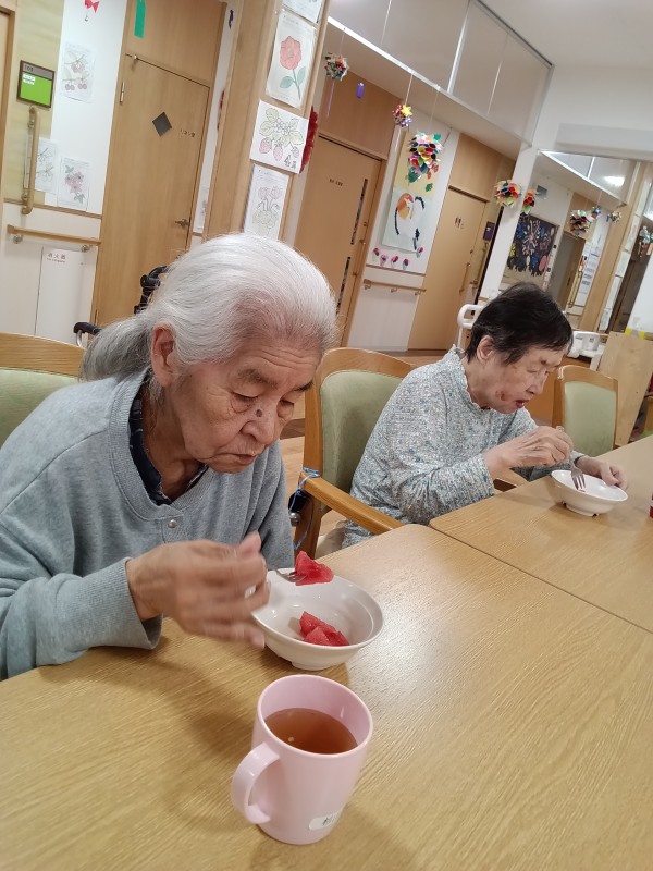 畑で採れた小玉スイカ、今年初挑戦で6個の収穫でした♪各フロアで順番に分けて1Uでは最後のスイカを食べましたლ(´ڡ`ლ)桃の差し入れもあり豪華なおやつになりましたね(´~`)モグモグ