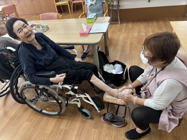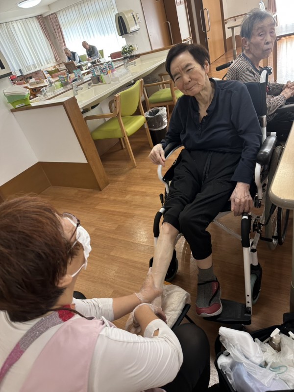 本日の二階フロアでは、楽しみにされていた『シニアセラピー』=足裏療法・顔面療法の施術で、足の浮腫や冷えの改善、嚥下機能の改善・向上が期待出来ます。温かいオイルでリンパに沿った施術を行い、筋肉を揉み解すことで足のポンプ機能が働き、足先まで血流が行き渡ります。