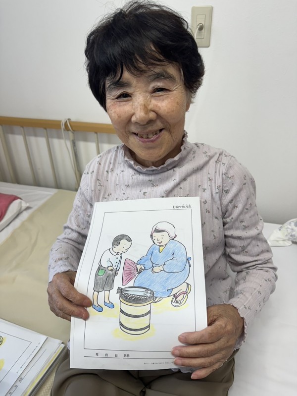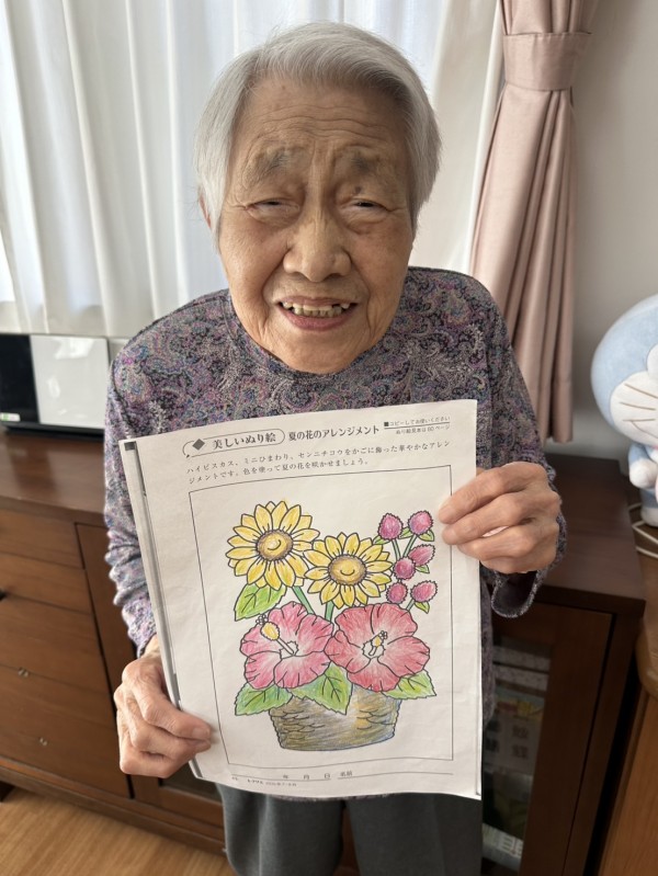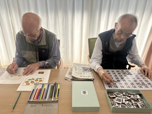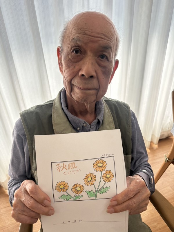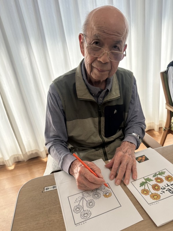 『季節の塗り絵』に談笑されながら取り組まれる方←皆様どんどん上達されて、秋らしい素敵な作品ばかりですね(๑˃̵ᴗ˂̵)