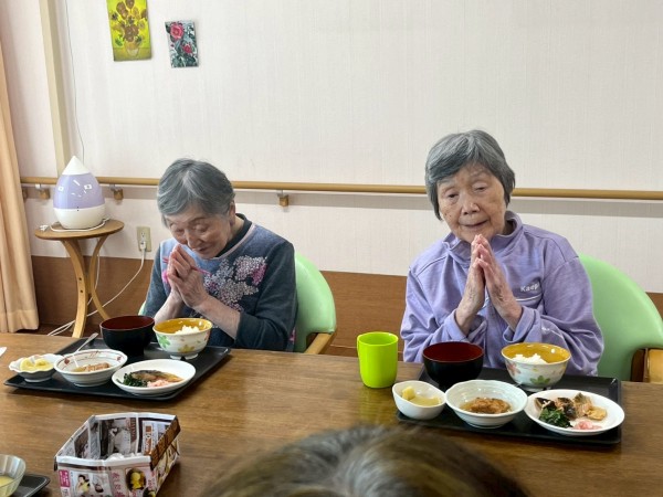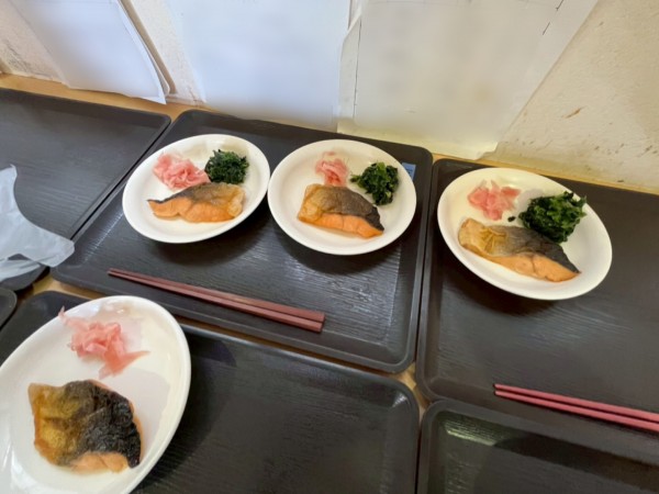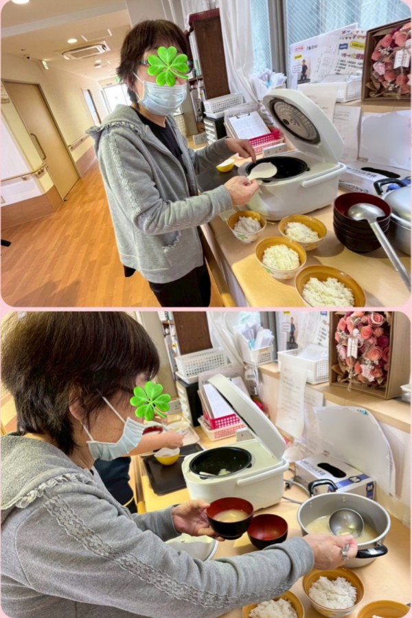 職員がおかずを盛り付けている隣で 利用者様がご飯とお味噌汁をよそって下さいました