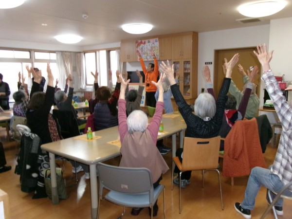 音楽に合わせてゆっくりと体を動かし、手足を伸ばしたり、無理のない動作を一つひとつ丁寧に行いました。