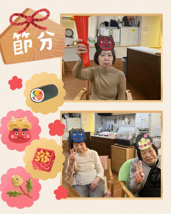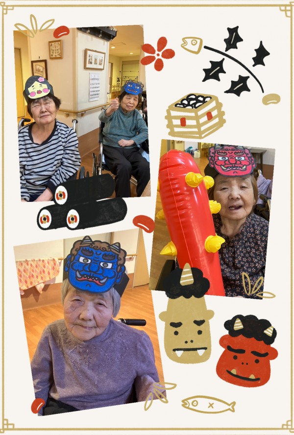 鬼のお面と金棒を手に、写真を撮りました(^^)