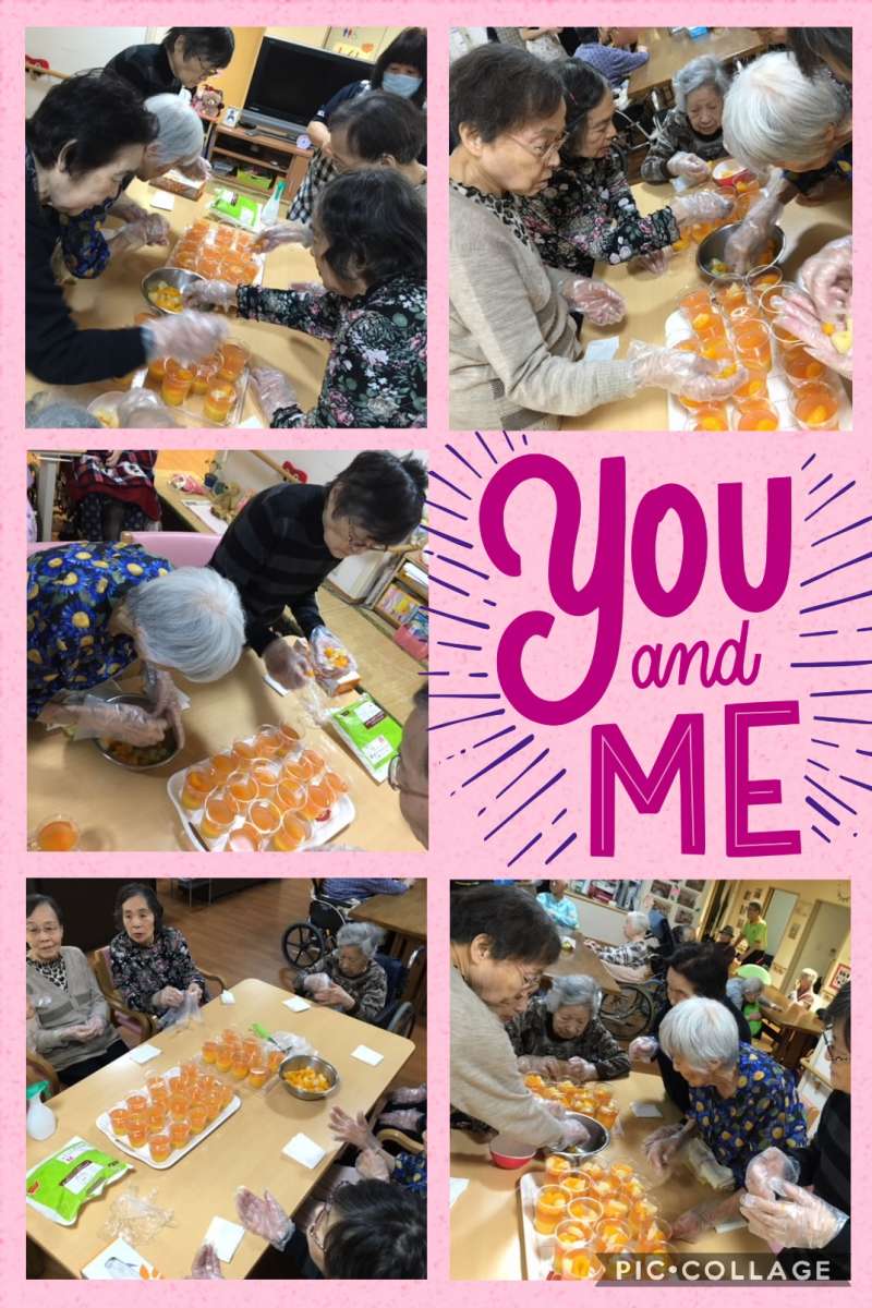 まずは仕込んでおいた3色ゼリーの上に、桃やみかんなどの果物をみなさまに乗せていただいて完成となりますワー\( *´ω`* )/-イ