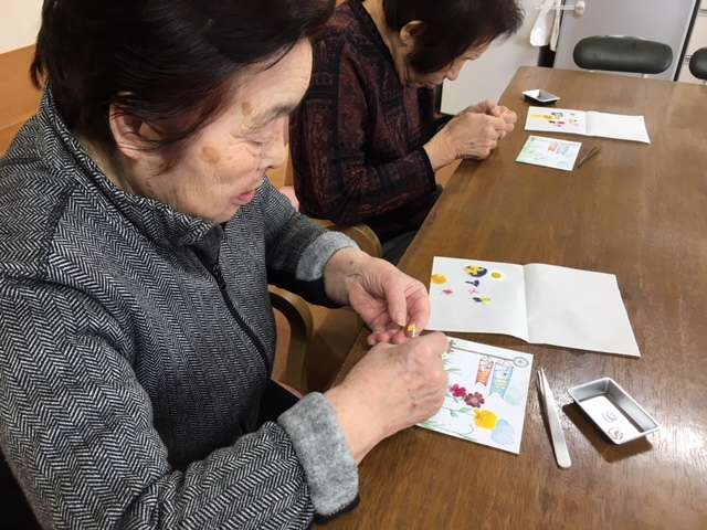 つまむのが難しい方などは、職員が付き添いながら花の位置を決めたり、糊付けしたりなどのお手伝いを致しました。