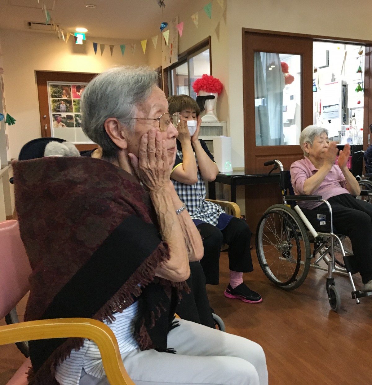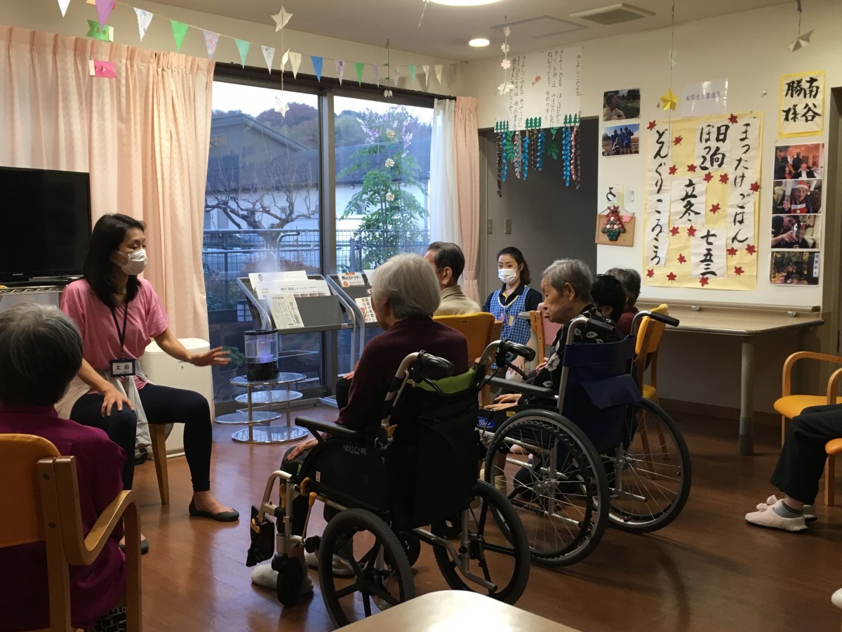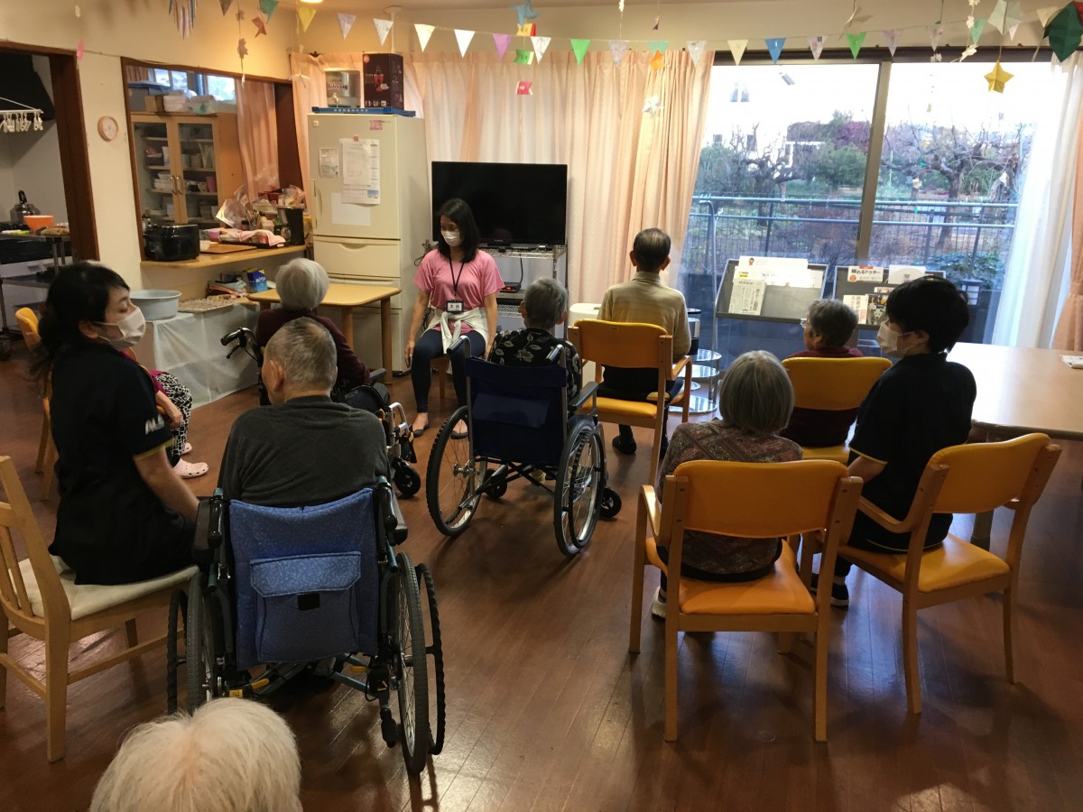 いるのですが、本日はその職員達を指導してくださったインストラクターさんをお招きしてご利用者様の皆様と夕食のお食事前の時間にほんのりとヨガレッスンをしていただきました(*'▽')