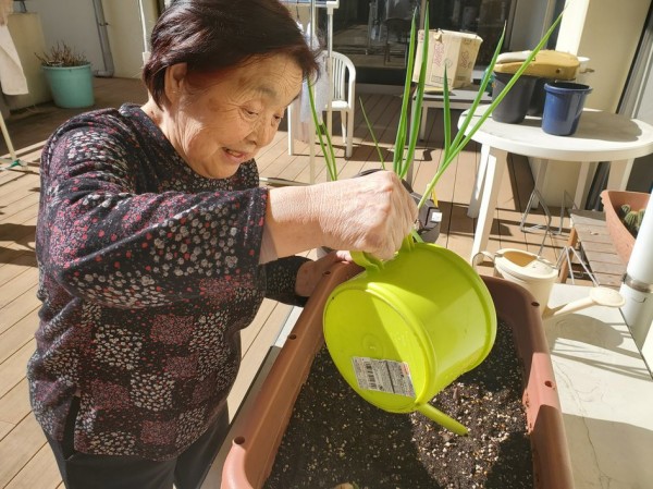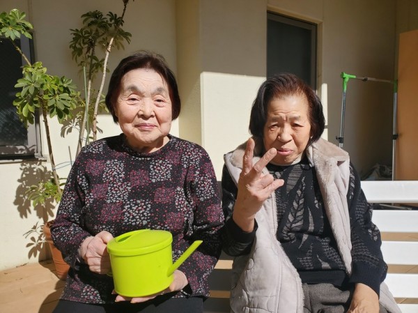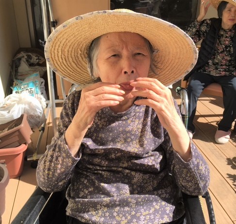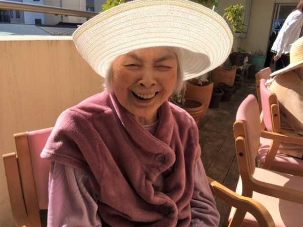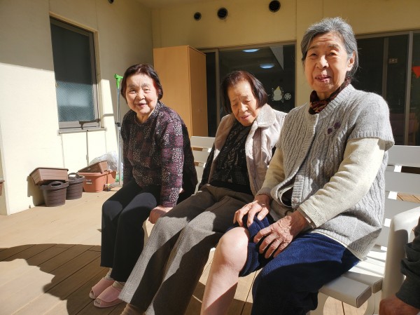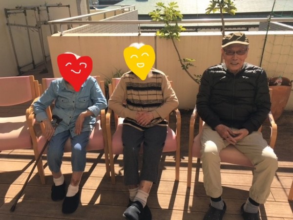 昼食後の昼下がり、リモートノーアエクササイズの前に、ご入居者様みなさんでウッドデッキにて日光浴をしましょう~♪