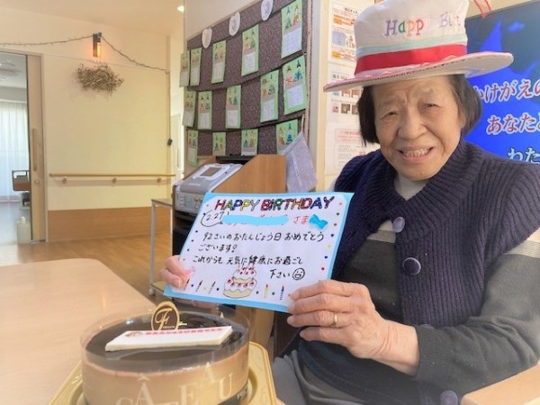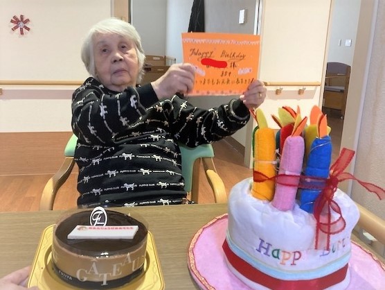 ご入居者様と職員で、ハッピバースデーの歌をうたいお誕生日カードをお渡しし、チョコレートケーキでお祝いです♪