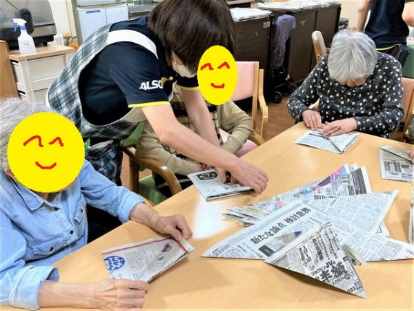 新聞紙で作った兜。