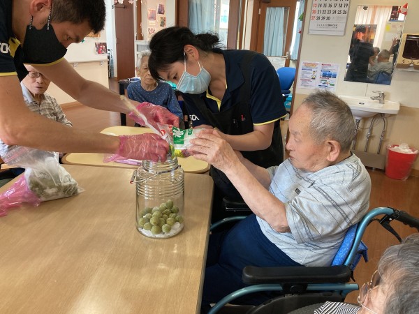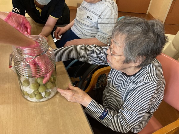 利用者様に机を囲んでもらい、順番に氷砂糖と梅を入れてもらいました!