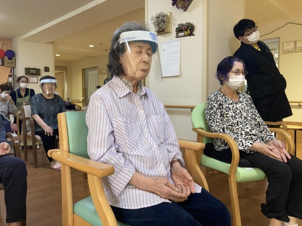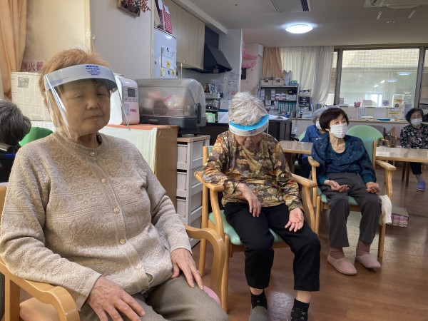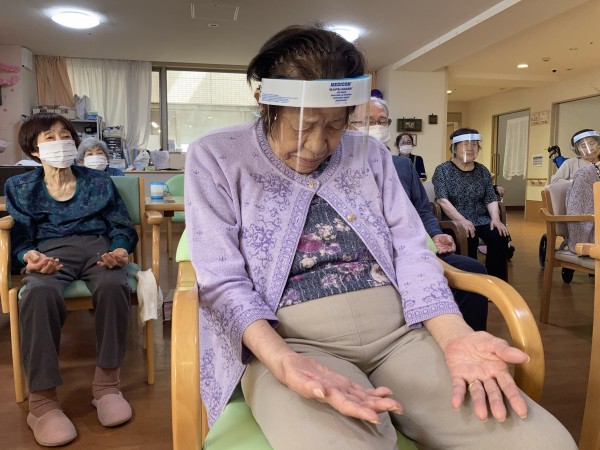 グループホームみんなの家・西尾久では、今回ご入居者様にフェイスシールドorマスクを着用してリモートあんしんヨガにご参加いただきました。