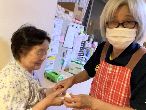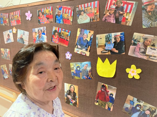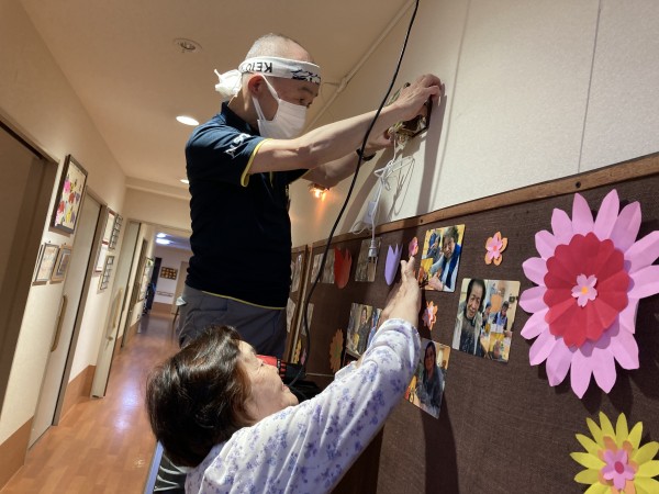 こちらのご入居者様M様は、就寝されるまでの時間、君島(きみしま)職員と一緒に掲示板の飾りをこつこつと作って下さっていました♪