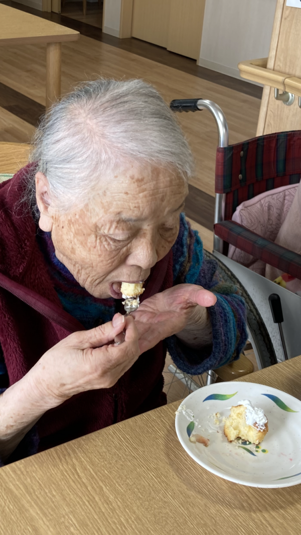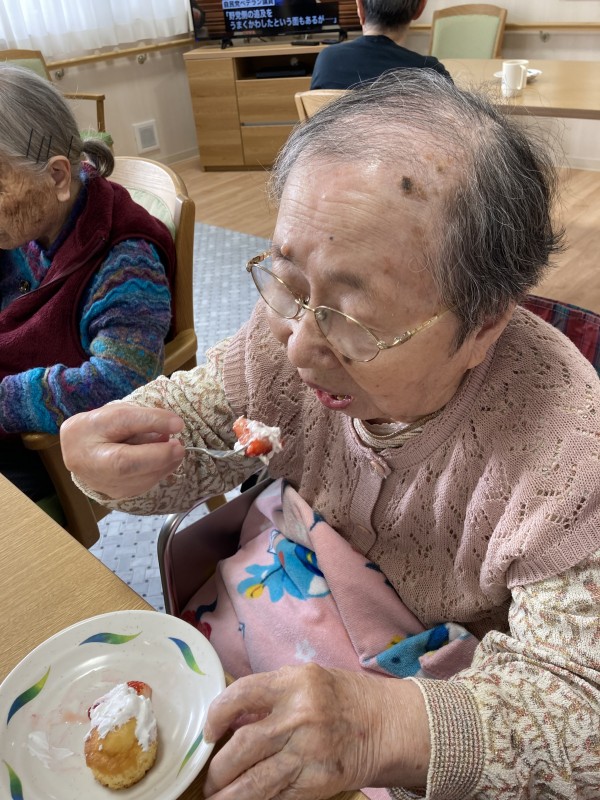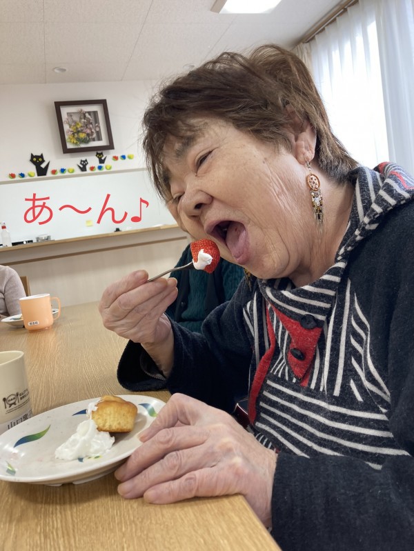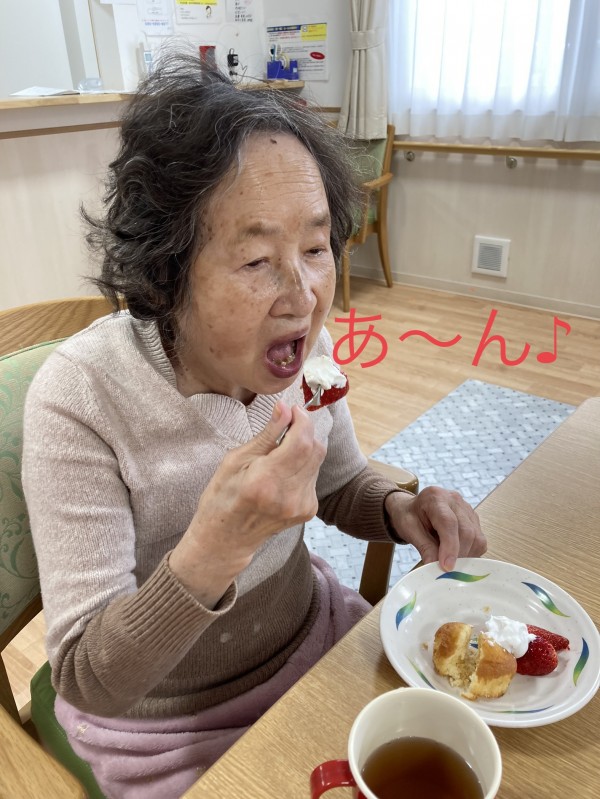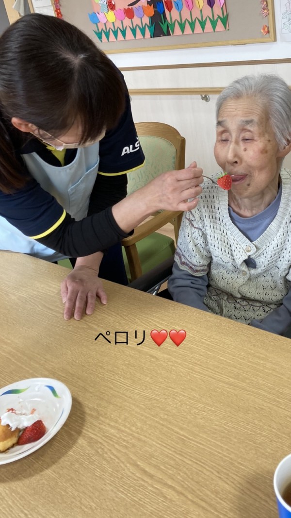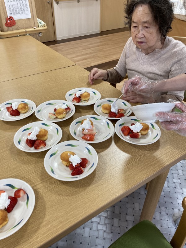ご家族様から差し入れのイチゴをおやつの時間にトッピング❗️生クリームも添えて更に豪華になりました〜♪