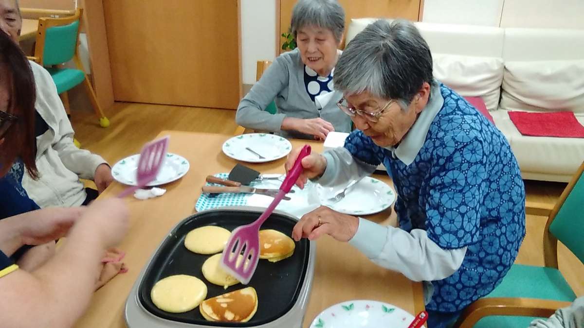 焼けたホットケーキをひっくり返して、ご利用者様同士で