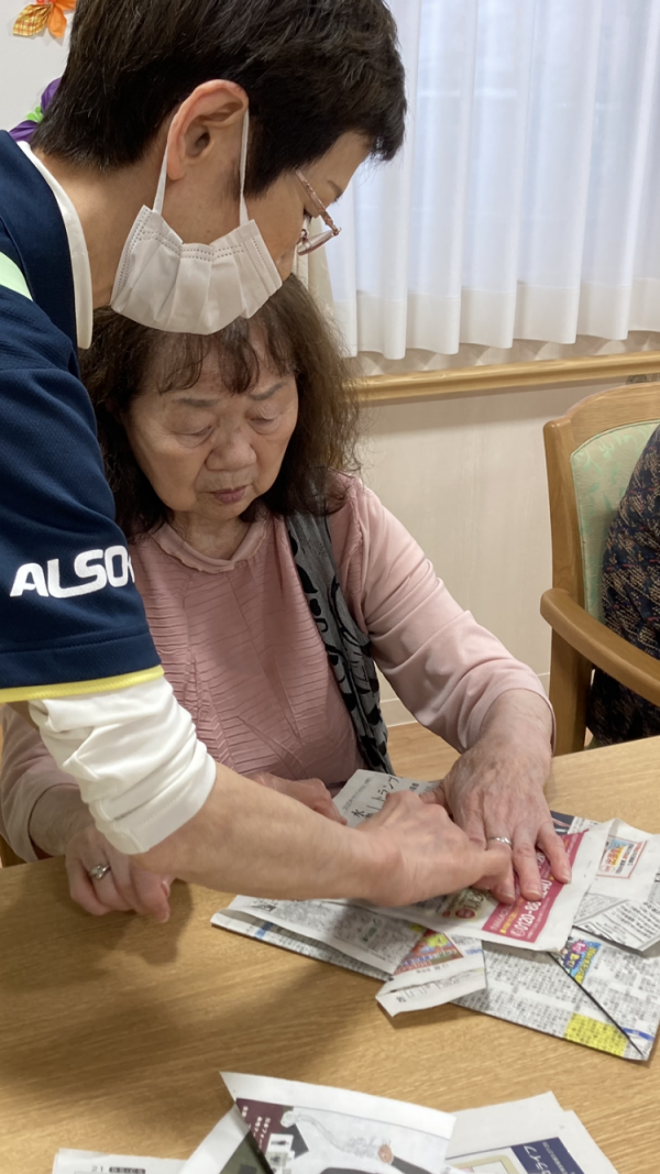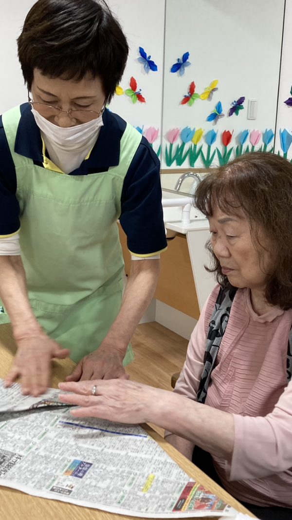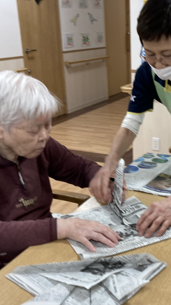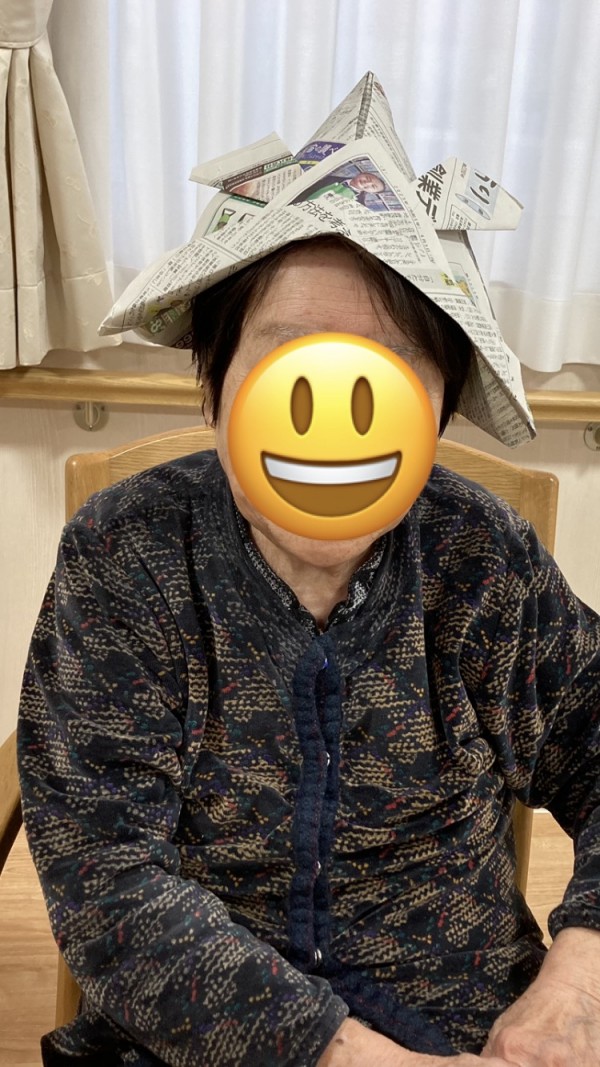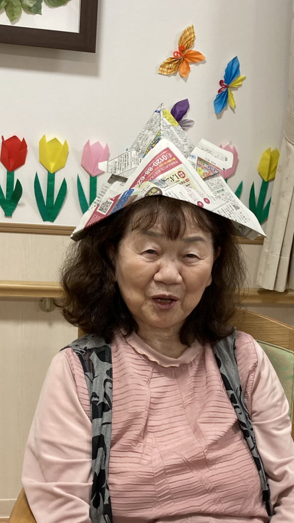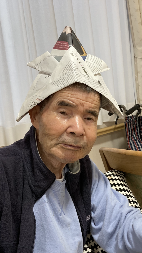今日は職員さんと一緒に兜を新聞紙で作って見ました〜皆さんも子供の頃は、折り紙や新聞紙で良く折って遊びましたよね♪久しぶりで覚えてるかなぁ?