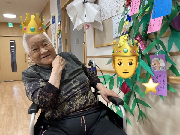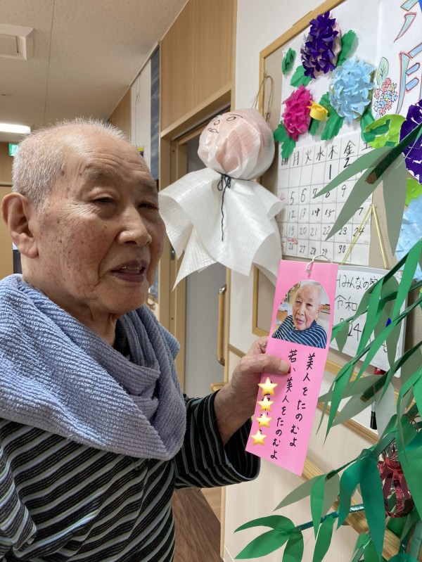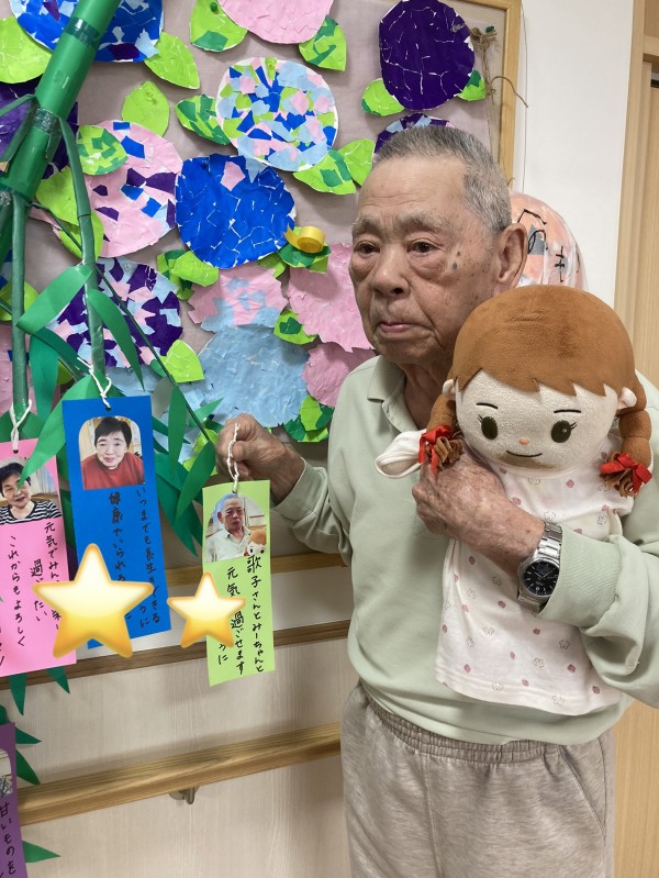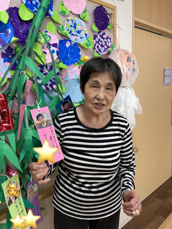 大きな笹に色とりどりの短冊に皆さんの願い事を書いて飾り付け♪願い事が届きますように‼️