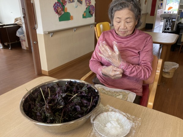はじめは腰かけて塩をまぶしていたご利用者様ですが