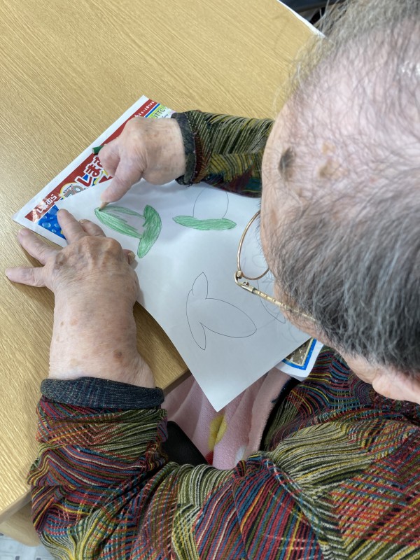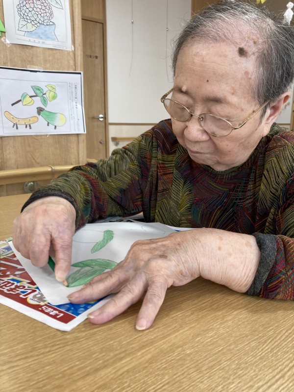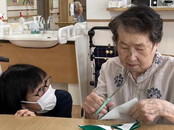 朝顔の葉を作成中!今回は職員が緑の折り紙と白い紙に葉の形を書いて見ました。