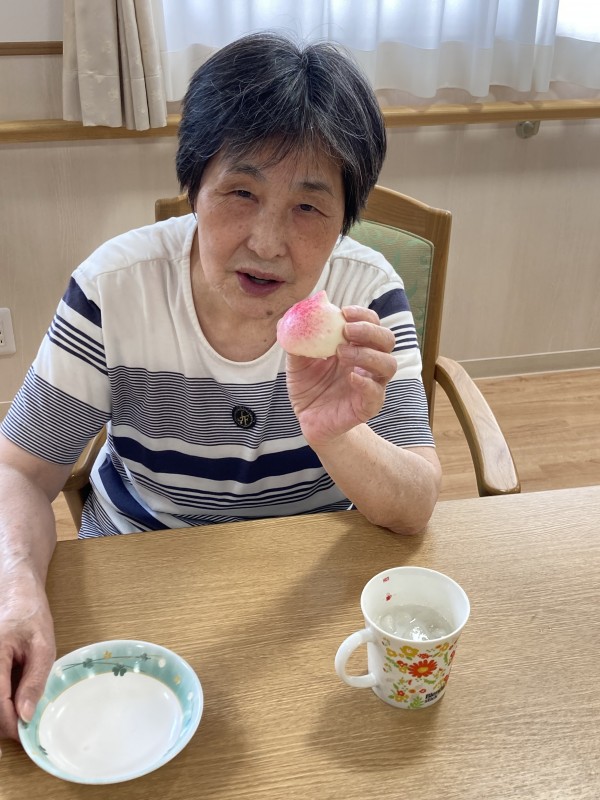 桃まんじゅうとカルピス!とても美味しいね〜(๑˃̵ᴗ˂̵)