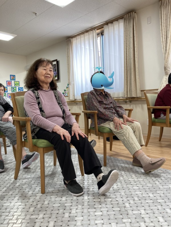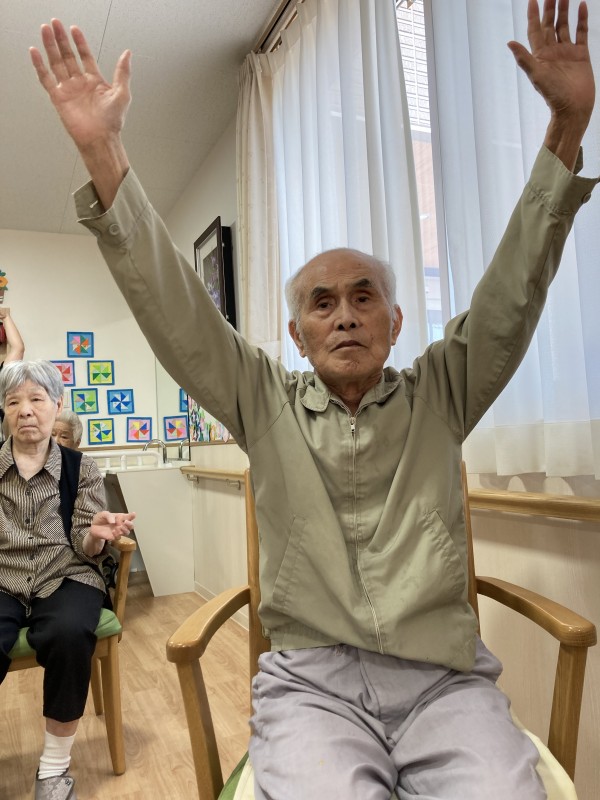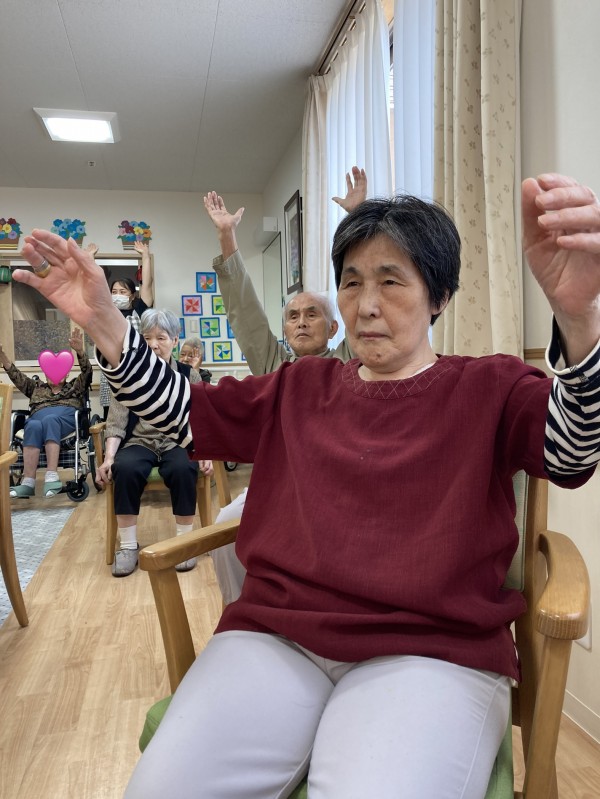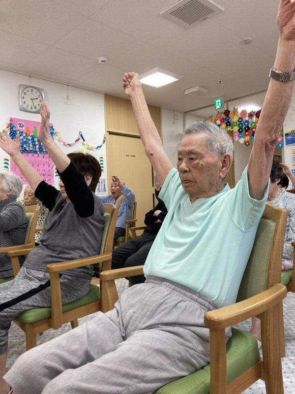 身体がほぐれたら、軽快な音楽に合わせてリズム体操スタート!腕を上げたり、足を上げたり、皆さん頑張ります!
