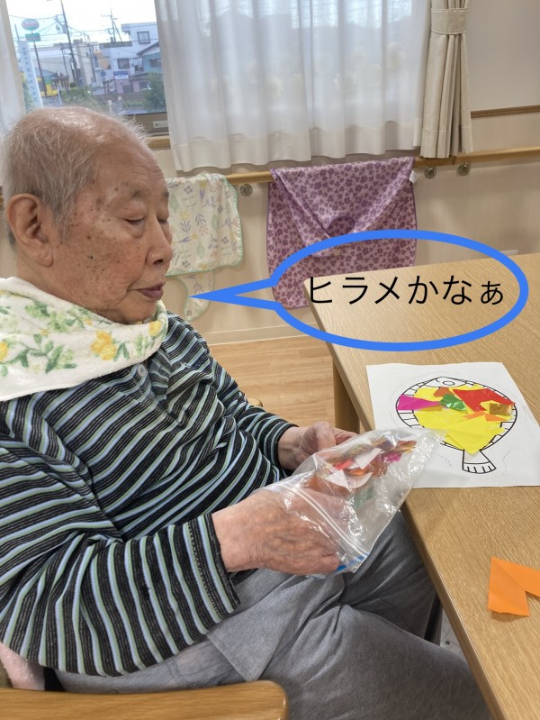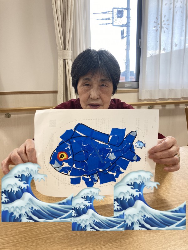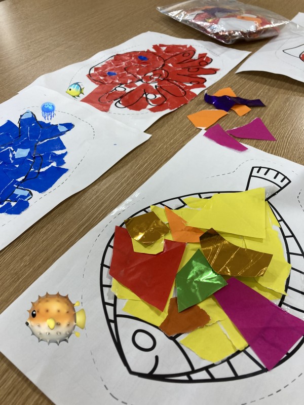 タコやサカナの下絵に折り紙でちぎり絵をしてみました。ちぎる紙の大きさを変えたり、少し色を変えてみたり、カラフルにしたりと皆さん工夫されて、とても立派な出来栄えです‼︎
