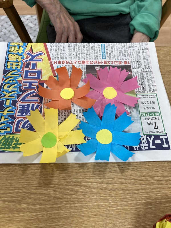 9月の壁飾りを作成しています♪カラフルなコスモスをたくさん作ります♡