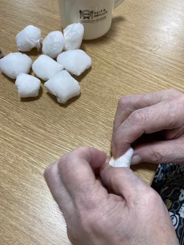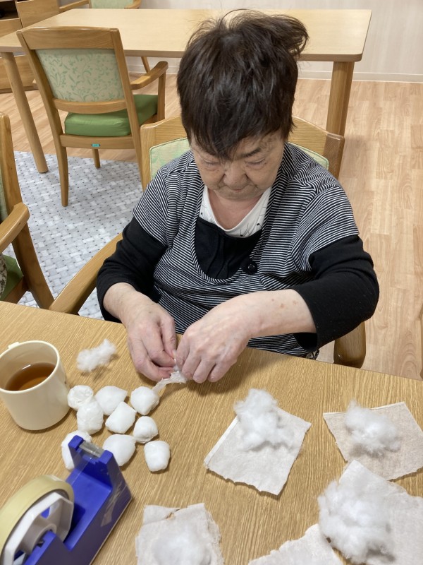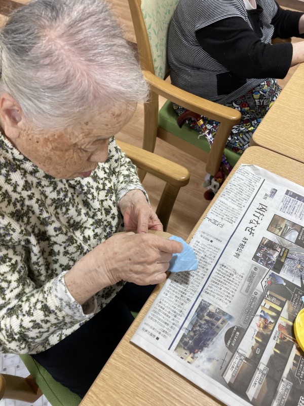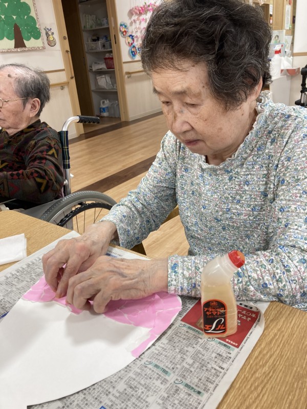 ピンクと水色の折り紙を小さくちぎって型紙に貼っていきます(^o^)指先を使って細かい作業ですね♡