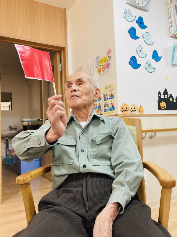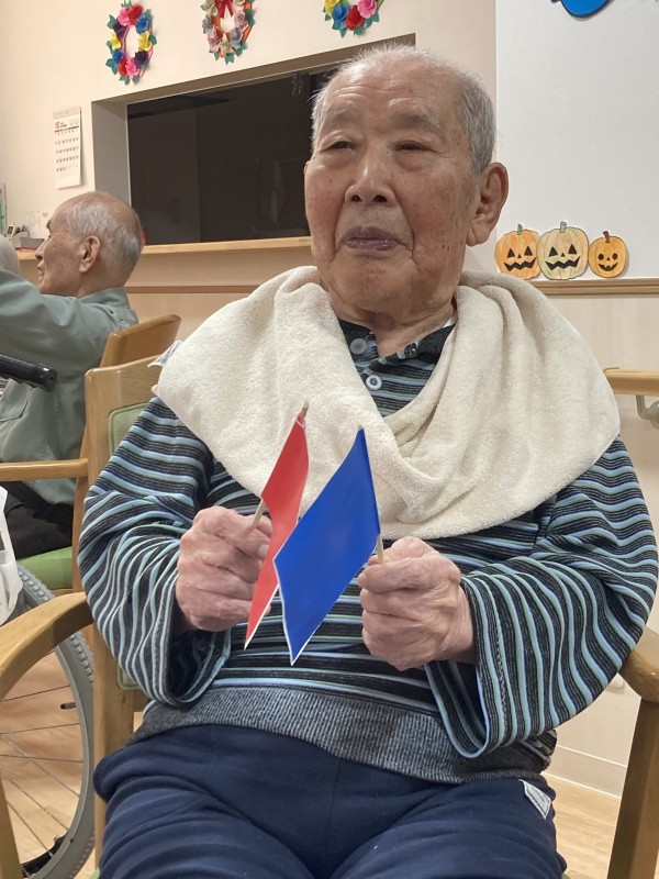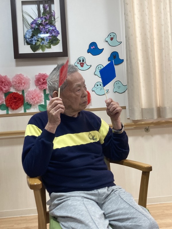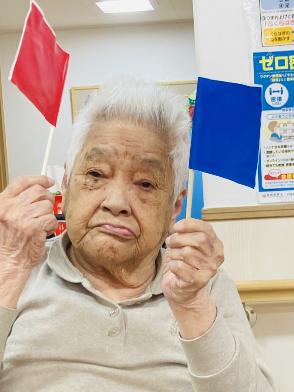 次は旗上げゲーム!先生のかけ声に合わせて赤と青の旗を上げたり下げたり♪