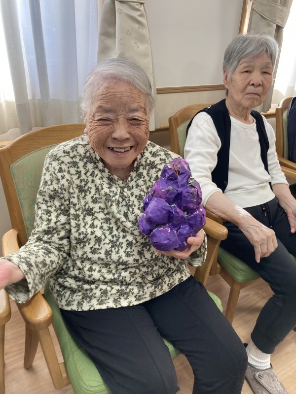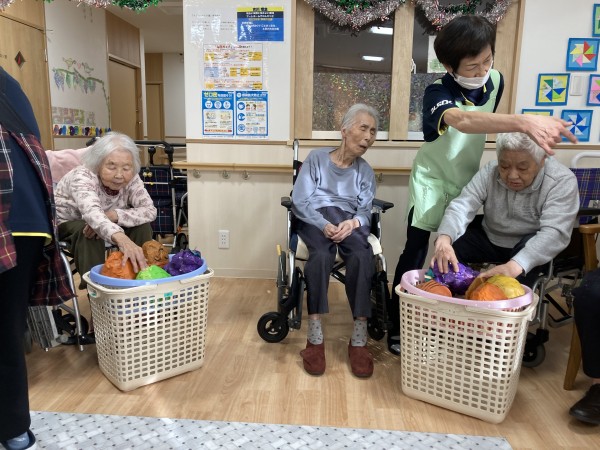 職員手作り♡の野菜や果物を隣の方にどんどん送って全部送り切ったチームの勝利です♪勝負となると皆さん燃えますね〜(^o^)