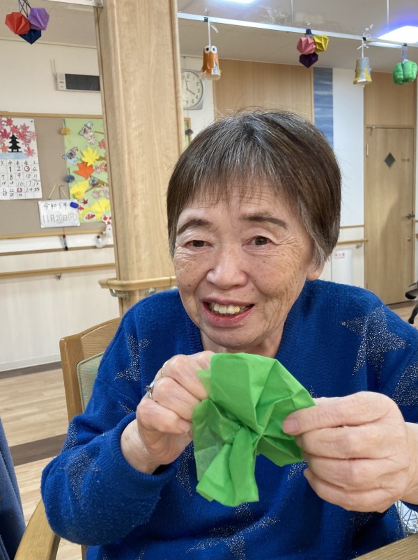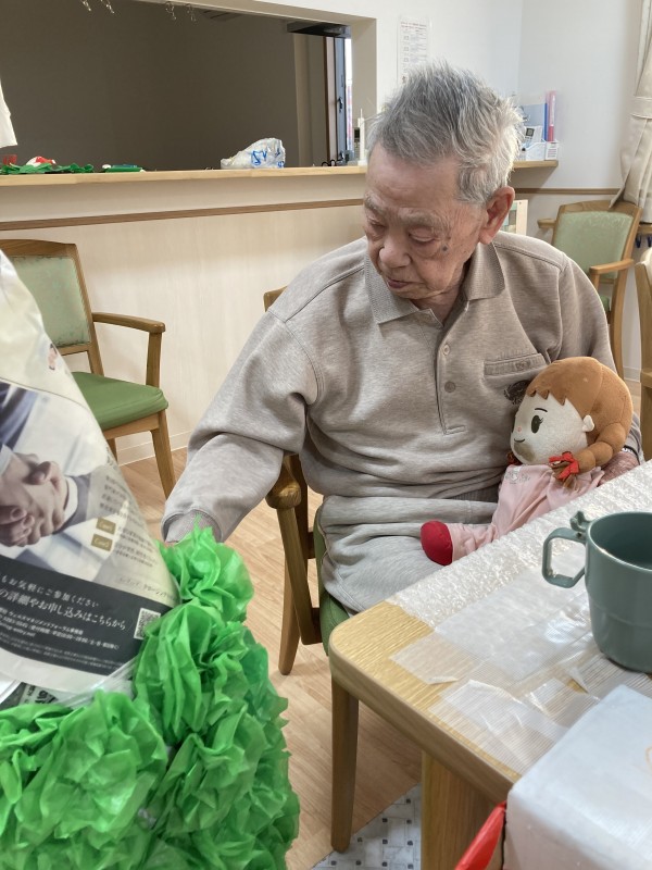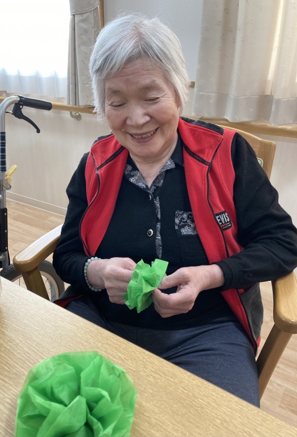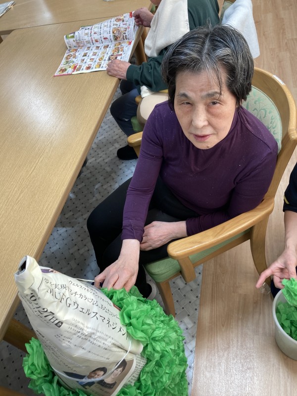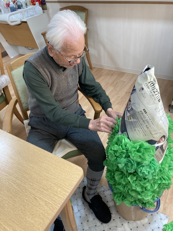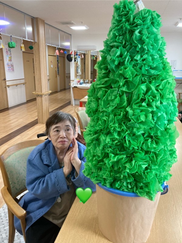 レクの時間に皆さん協力して作った緑のお花を貼っていくと‥大きなツリーの出来上がり!