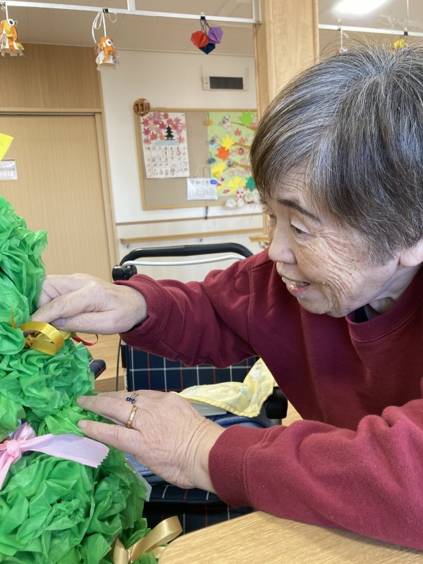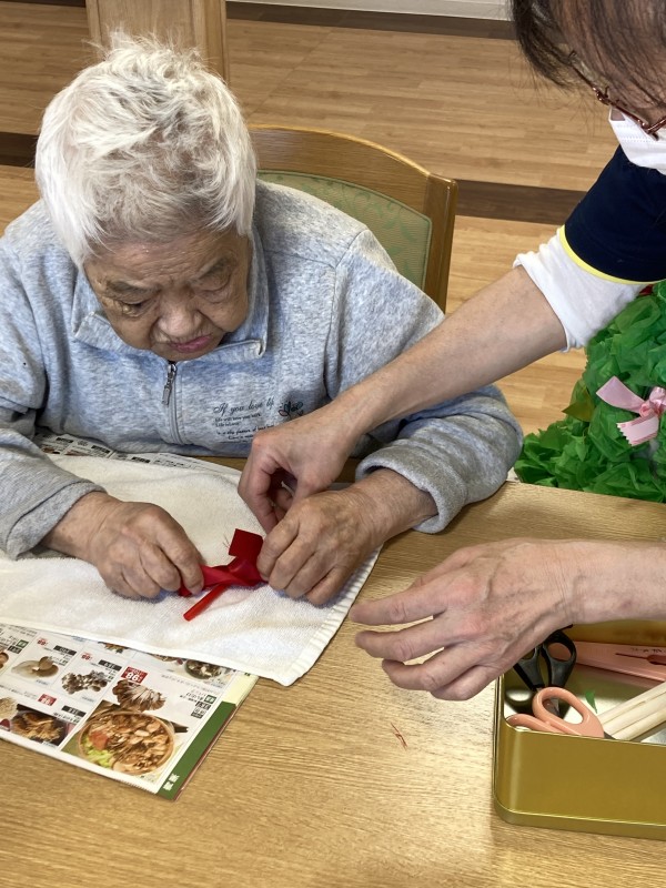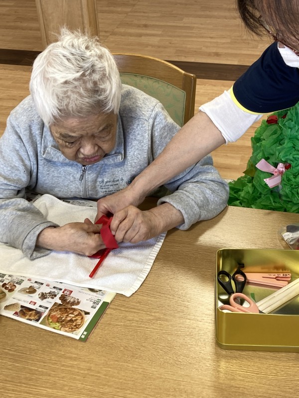 出来ないよ〜の声で、職員さんが、一緒に結びましょう♪くるっと回して、きゅっと結んで、出来上がり(^_^)v