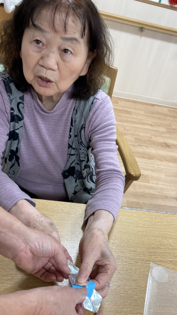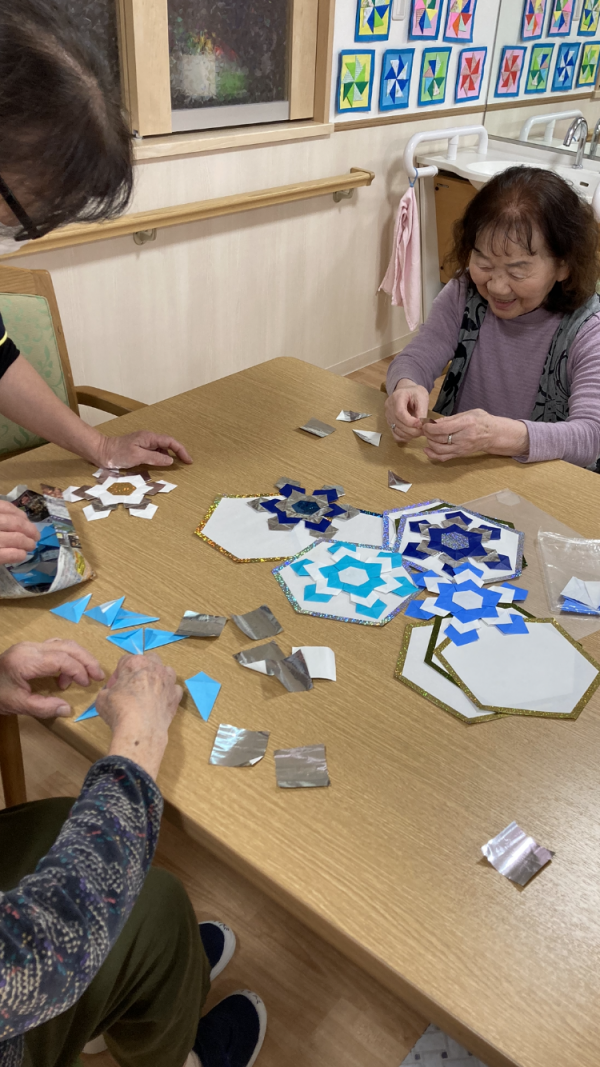 今回、折り紙で素敵な雪の結晶作りに挑戦です!「どう作るの?」「出来るかしら?」と細かな手順も真剣に聞きながら沢山の結晶が出来ました〜飾り付けも楽しみですね♪