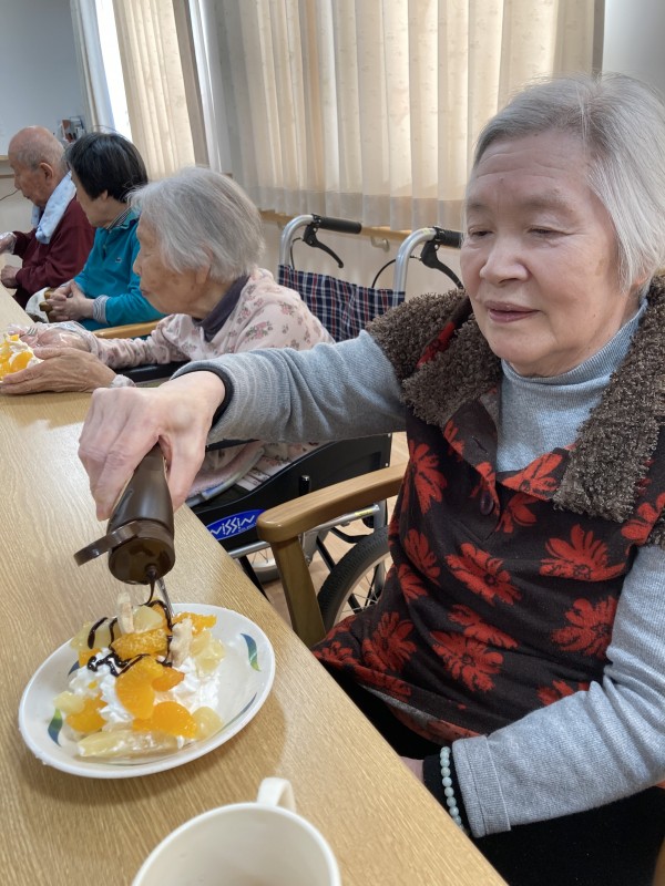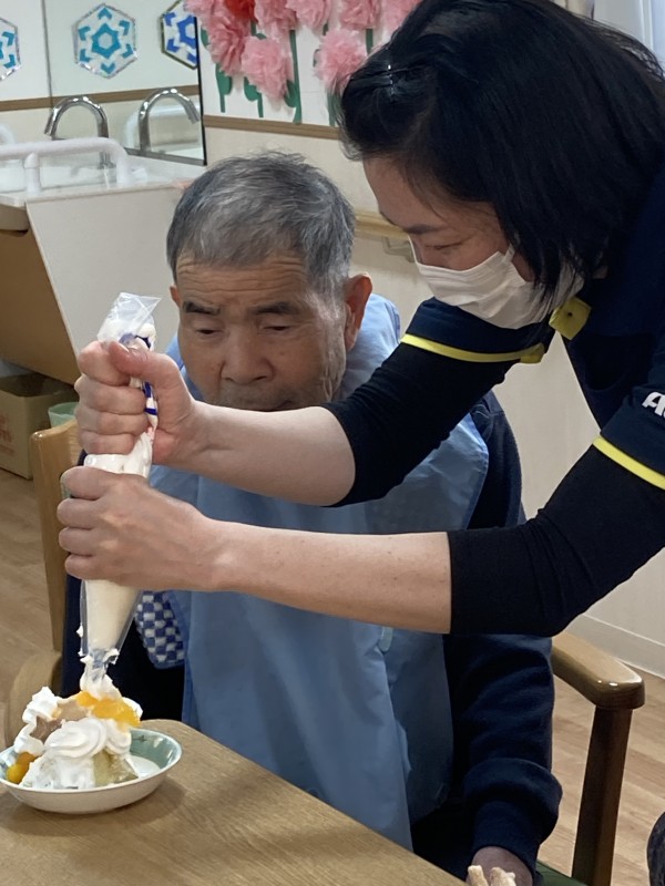 皆さん楽しそうにフルーツやクッキー、生クリームやチョコソースをトッピング♪
