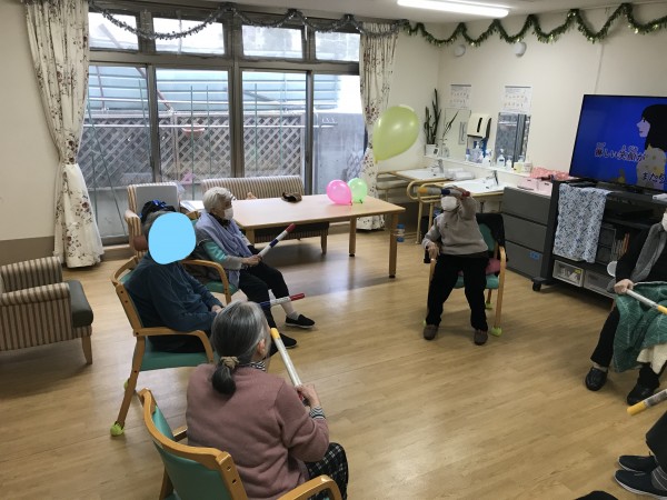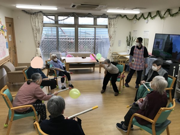 後半は新聞で作った棒を使いながら風船バレーを行い、集中しないと棒に当たらないので皆さん