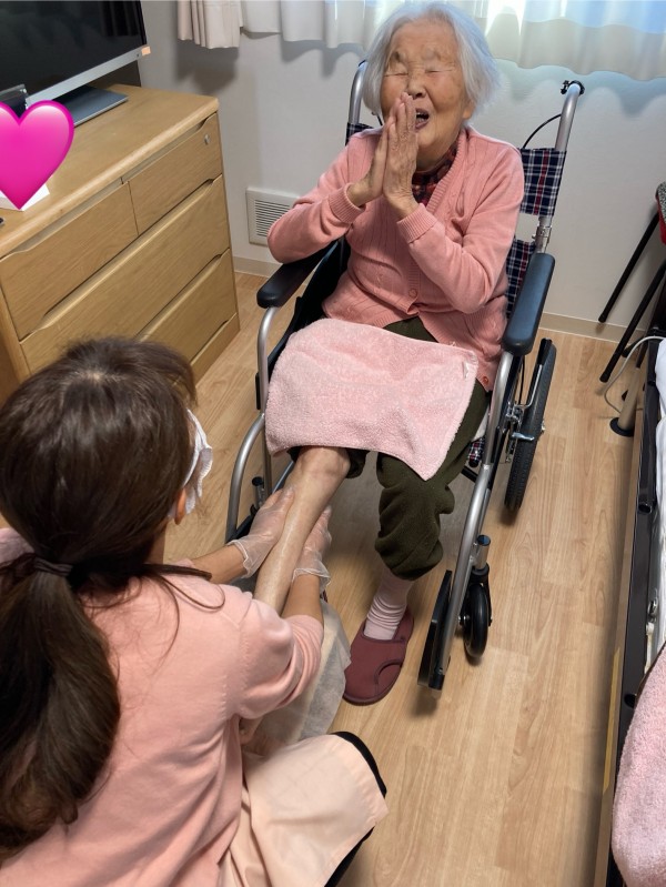 セラピストさんが、私たち、お揃いのピンクのカーディガンで、何とか姉妹みたいね!