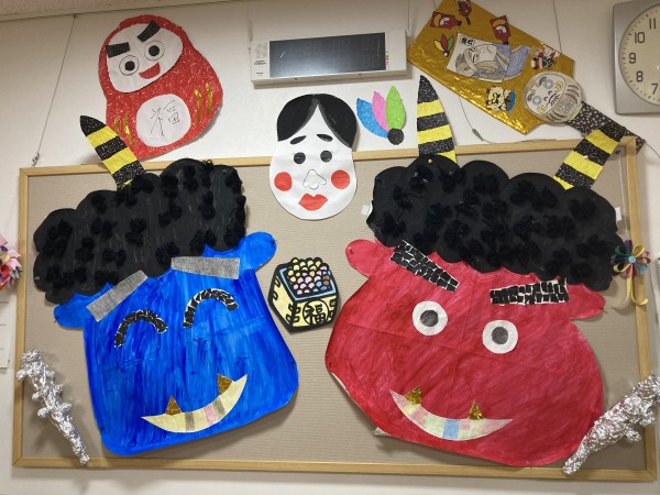 何を作っているか分かりますか?鬼が持っている物と言えば…。前回絵の具で塗っていた大きな鬼が少しずつ完成しました〜╰(*´︶`*)╯♡