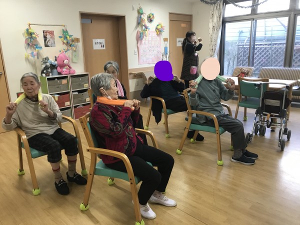 テレビ画面からですので職員もご利用者様に声を掛けながら見本になりながら行う事で